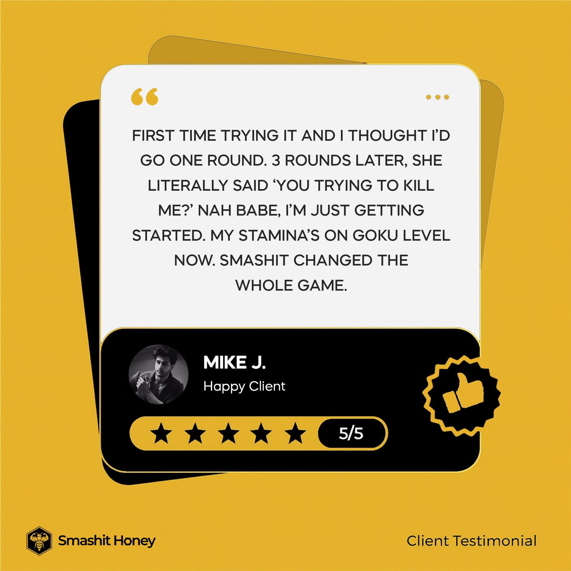 Enjoy Smashit Honey about 30–40 minutes before intimacy. Simply tear open the pack, squeeze it out, and mix it into your favorite warm beverage, or take it as is, depending on what feels right for you.